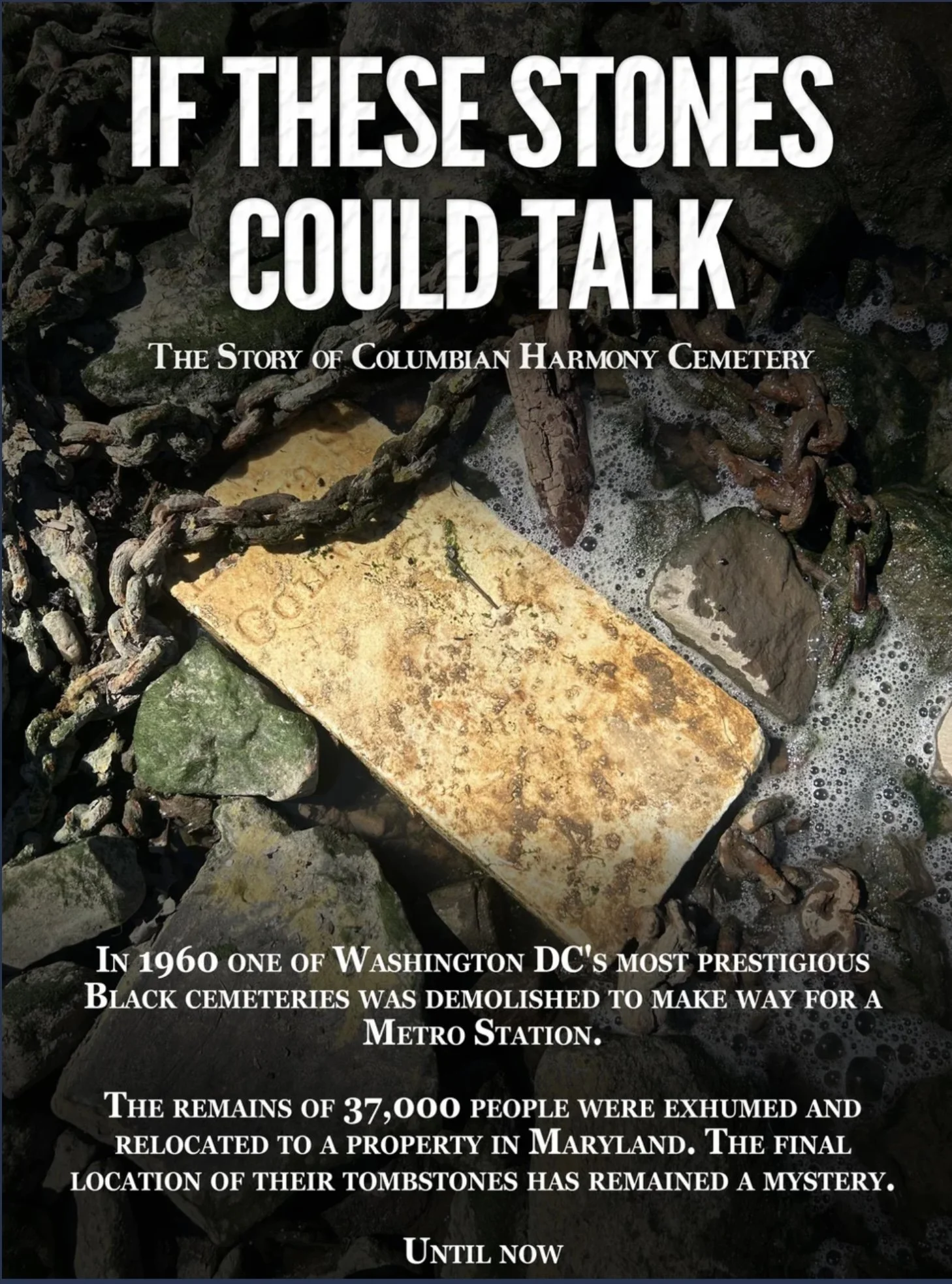 In 1959, Columbian Harmony Cemetery, Washington DCβs most prominent burial grounds for Americans of African Descent was sold. While the remains of the 37,000 interred were relocated to the larger National Harmony Memorial Park in nearby Landover, Maryland, the headstones, monuments and grave markers dumped along the banks of the Potomac River as makeshift riprap.